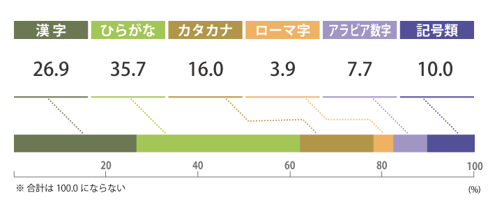 漢字 26.9%。ひらがな 35.7%。カタカナ 16.0%。ローマ字 3.9%。アラビア数字 7.7%。記号類 10.0。