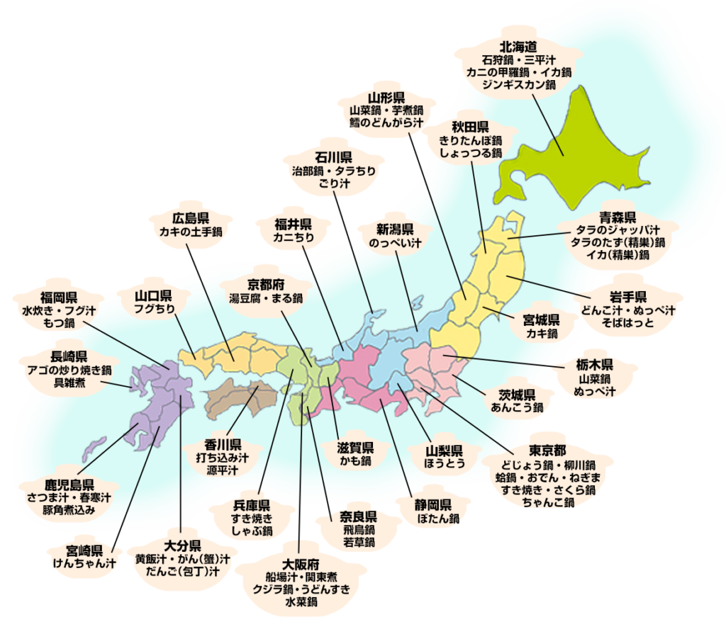 日本の食文化: 縄文時代から続く馴染み深い料理で、地域ごとの郷土鍋・ご当地鍋・名物鍋(石狩鍋、水炊きなど)も豊富。