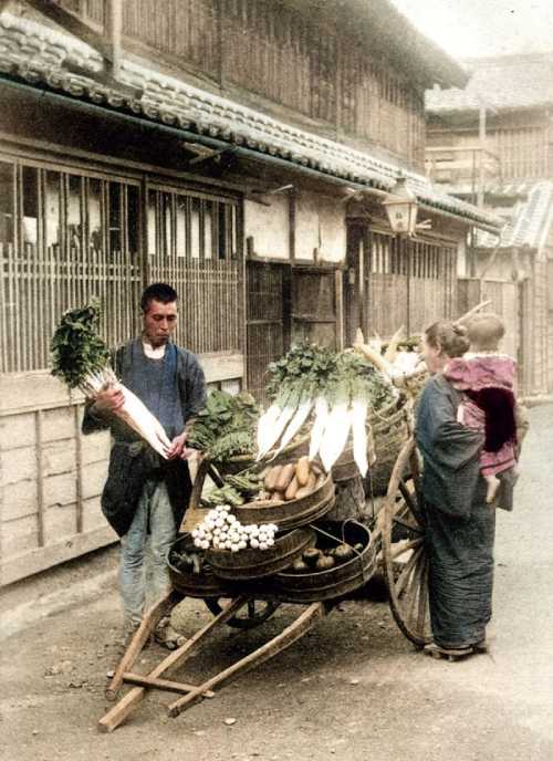 • 江戸時代(店舗の誕生): 17世紀に入り、店を構えて野菜を販売する業態が登場しました。当初は野菜だけでなく様々な食材を扱っていましたが、18世紀頃には野菜類を専門に扱う「青物屋」として確立されました。また、都市部の市場(神田など)から仕入れる流通網もこの頃に整備されました。