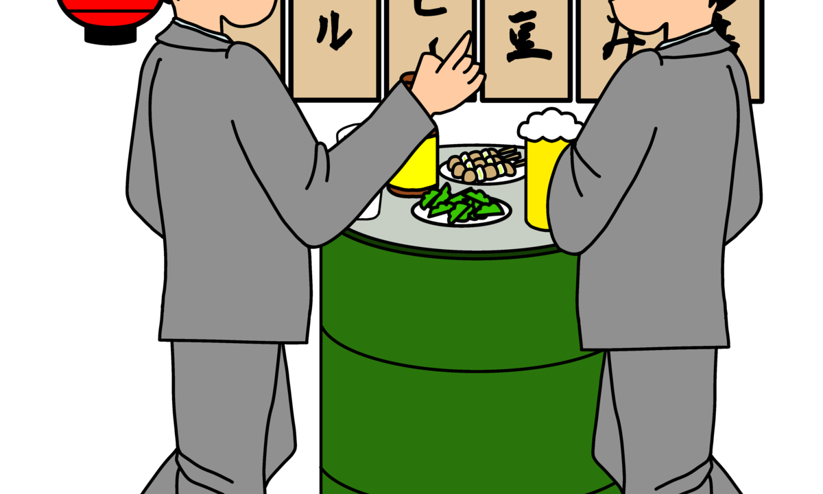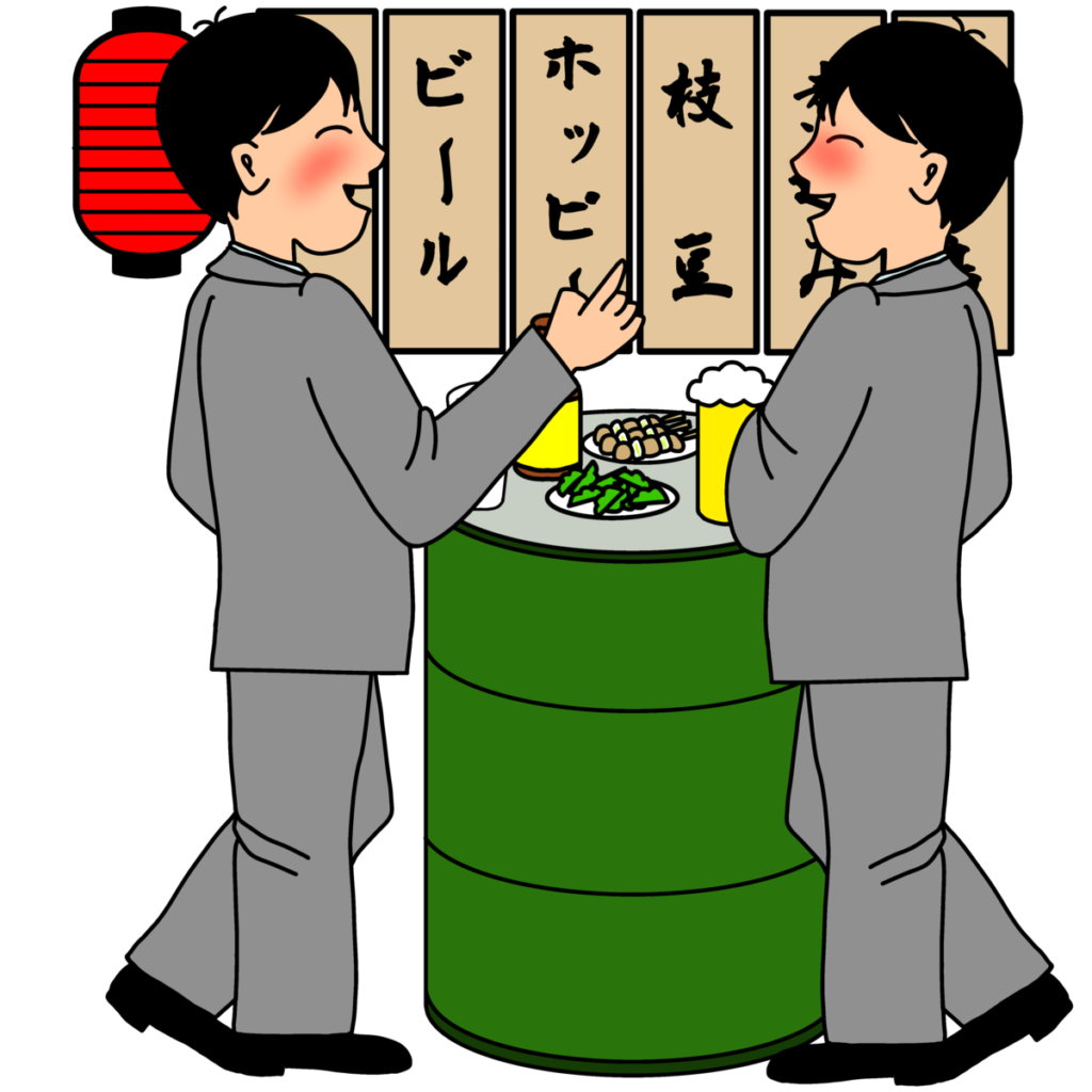 立ち飲み: 椅子がなく、立ちながら飲むスタイル。駅周辺や作業員街に多い。