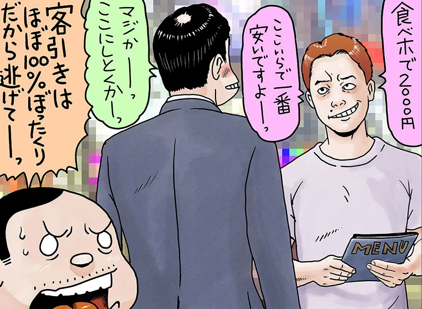 - 客引きで「飲み放題3,000円」などと安価を強調。